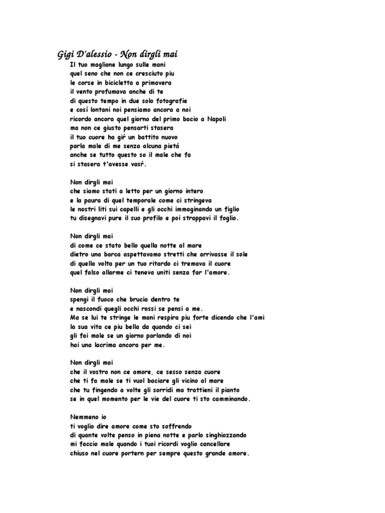 Non dirgli mai che siamo stati a letto. Tu disegnavi pure il suo profilo e poi strappavi il foglio. Non dirgli mai che il vostro non è amore è sesso senza cuore che ti fa male se ti vuol baciare lì vicino al mare. Gigi d alessio non dirgli mai più testo youtube.